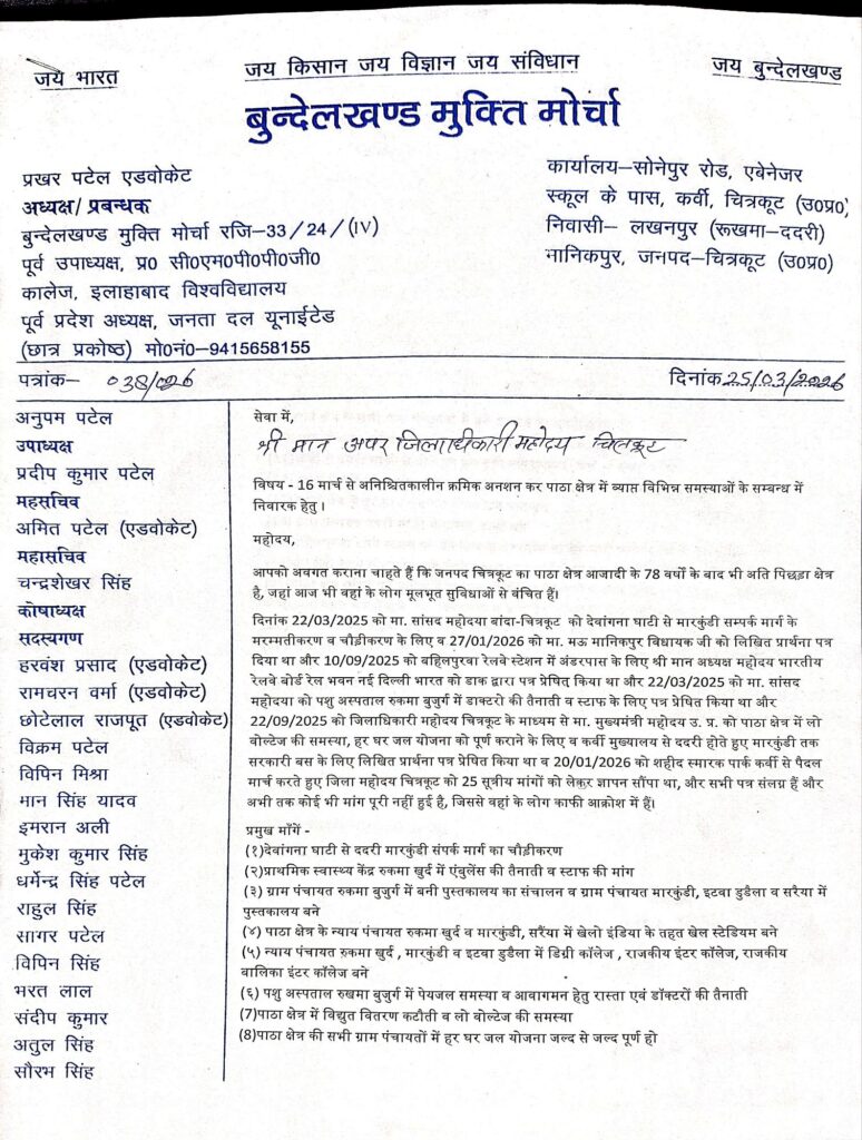 चित्रकूट जनपद के पाठा क्षेत्र में मूलभूत सुविधाओं की मांग को लेकर चल रहा अनिश्चितकालीन क्रमिक अनशन अब एक महत्वपूर्ण मोड़ पर पहुंच गया है। 16 मार्च 2026 से शुरू हुए इस आंदोलन ने स्थानीय जनता की लंबे समय से चली आ रही समस्याओं को एकजुट स्वर में प्रशासन के सामने रखने का काम किया है। 25 मार्च 2026 को अनशन के दसवें दिन जिला प्रशासन की ओर से सकारात्मक पहल देखने को मिली, जब अपर जिलाधिकारी स्वयं धरना स्थल पर पहुंचे और आंदोलनकारियों से सीधा संवाद स्थापित किया।