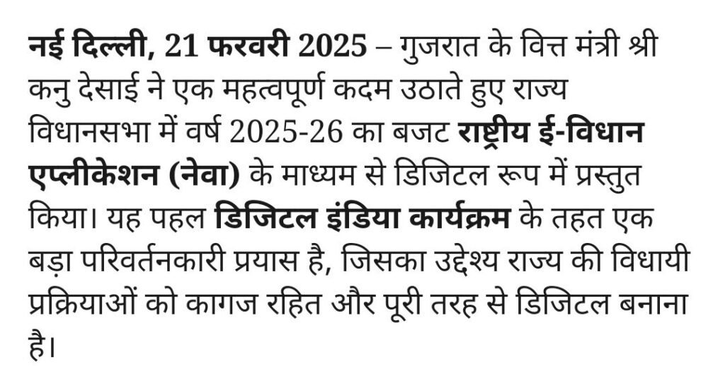 नई दिल्ली, 21 फरवरी 2025 – गुजरात के वित्त मंत्री श्री कनु देसाई ने एक महत्वपूर्ण कदम उठाते हुए राज्य विधानसभा में वर्ष 2025-26 का बजट राष्ट्रीय ई-विधान एप्लीकेशन (नेवा) के माध्यम से डिजिटल रूप में प्रस्तुत किया। यह पहल डिजिटल इंडिया कार्यक्रम के तहत एक बड़ा परिवर्तनकारी प्रयास है, जिसका उद्देश्य राज्य की विधायी प्रक्रियाओं को कागज रहित और पूरी तरह से डिजिटल बनाना है।